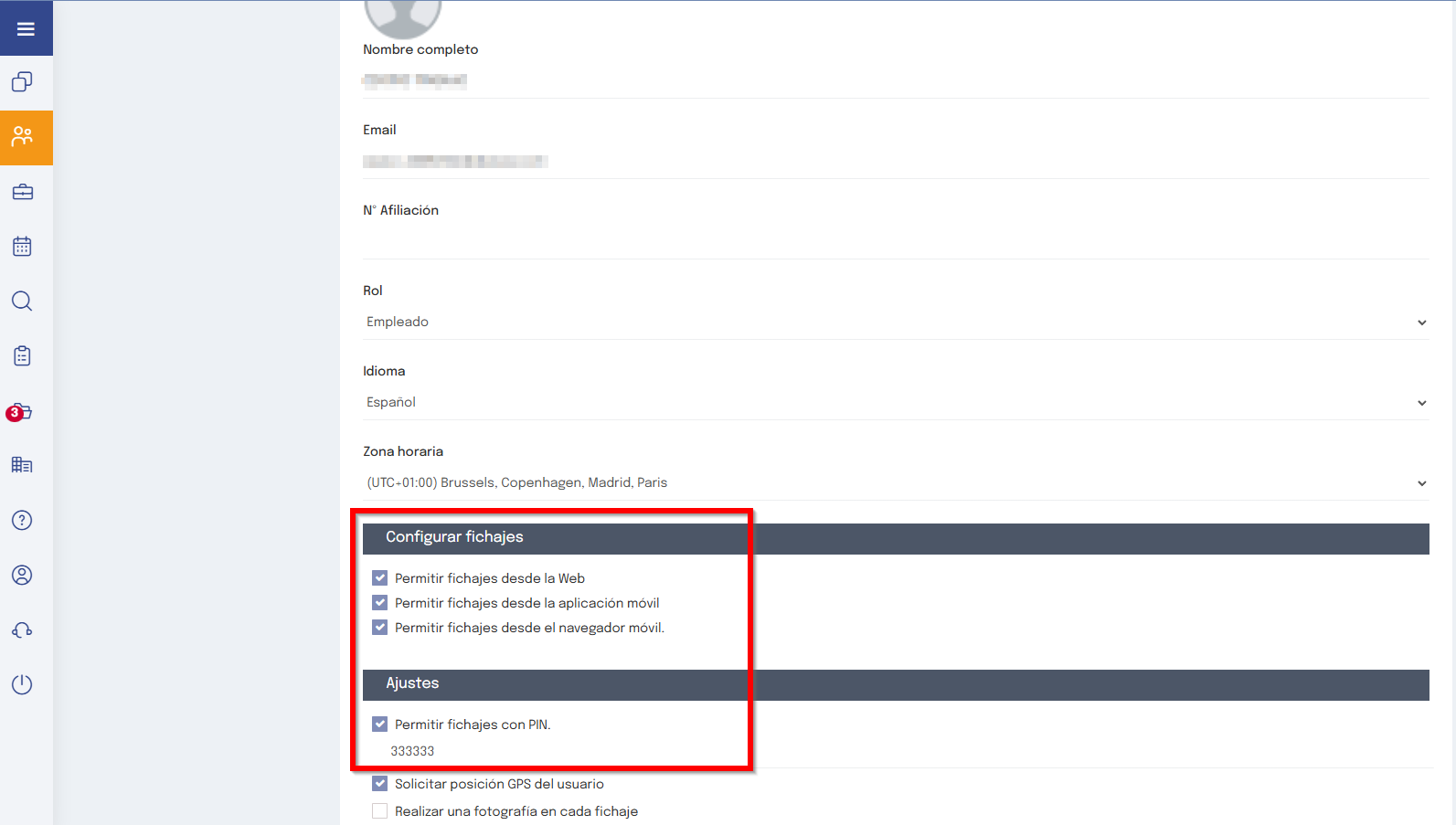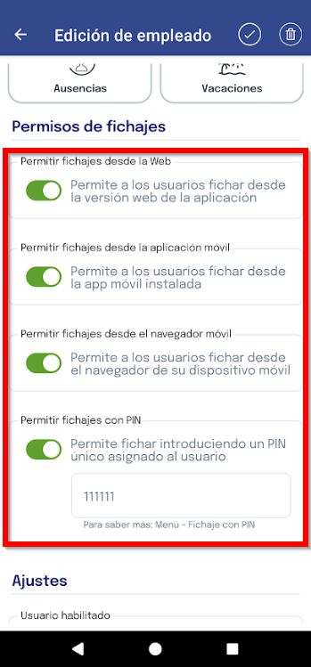 Fichaje con PIN: SI activas esta opción, el usuario, además de fichar de forma normal, podrá fichar en un dispositivo habilitado para fichar por PIN utilizando el PIN que des de alta.