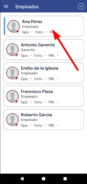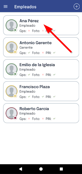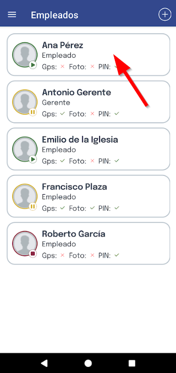 Después, podrás visualizar el PIN de cada empleado en caso de que tenga activado el fichaje por PIN y se indicará con un check verde o aspa roja si tiene activado el GPS en los fichajes y las notificaciones o si está desactivado, respectivamente.