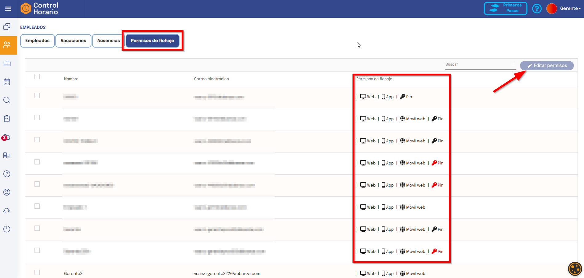 -Acceder a la sección Empleados/Permisos de fichaje. Una vez ahí, podrá ver los permisos que tienen todos los empleados actualmente y, si lo desea, cambiarlos de manera masiva: