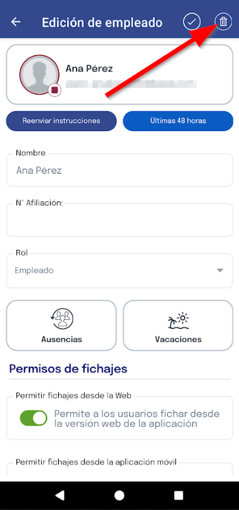 Para borrar un empleado en la App Móvil deberás pulsar sobre el empleado y pulsar en el botón representado por una papelera.