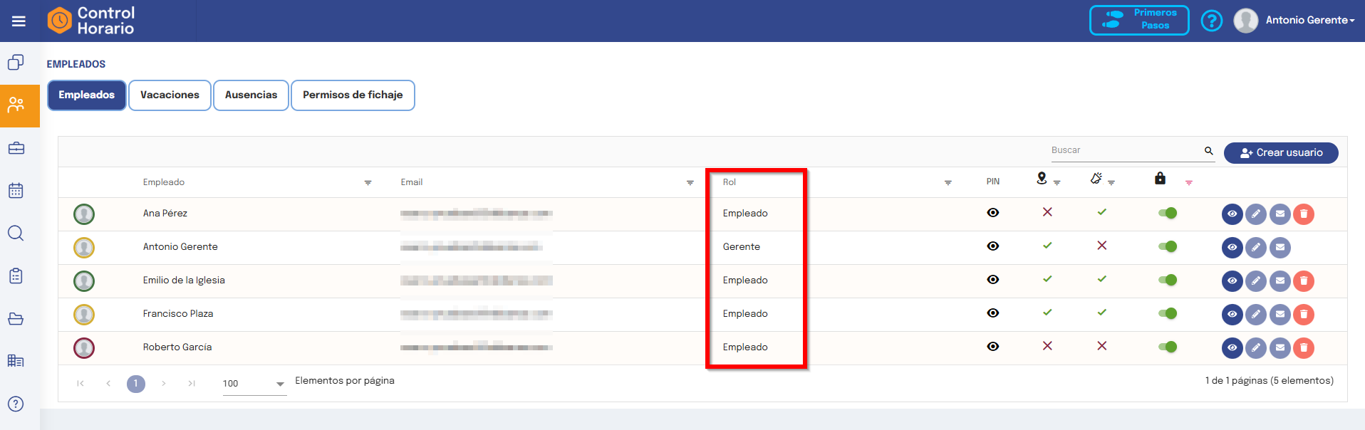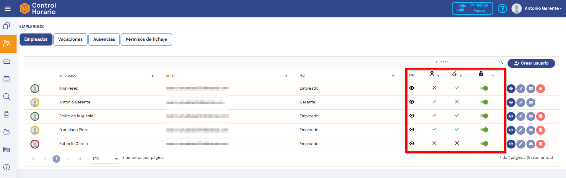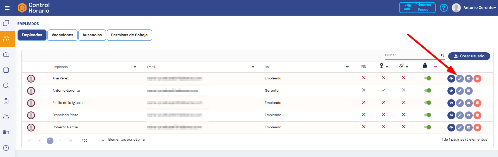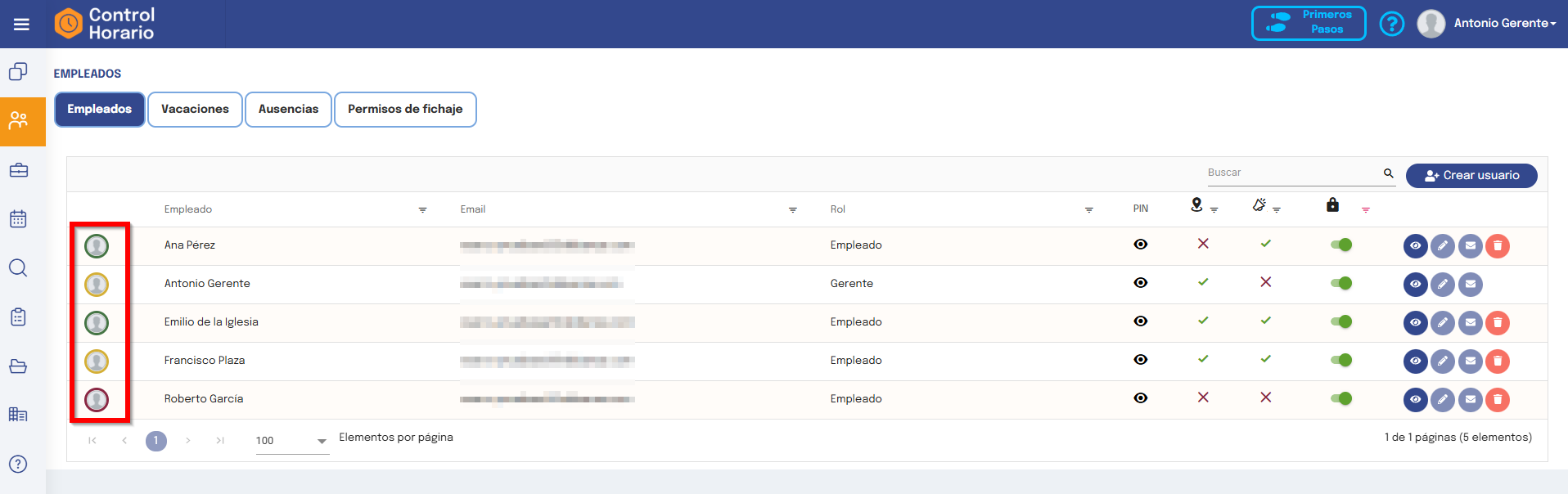 En el listado de empleados podrás ver todos los usuarios que tienes dados de alta con información de los detalles más importantes, así como su estado actual.
