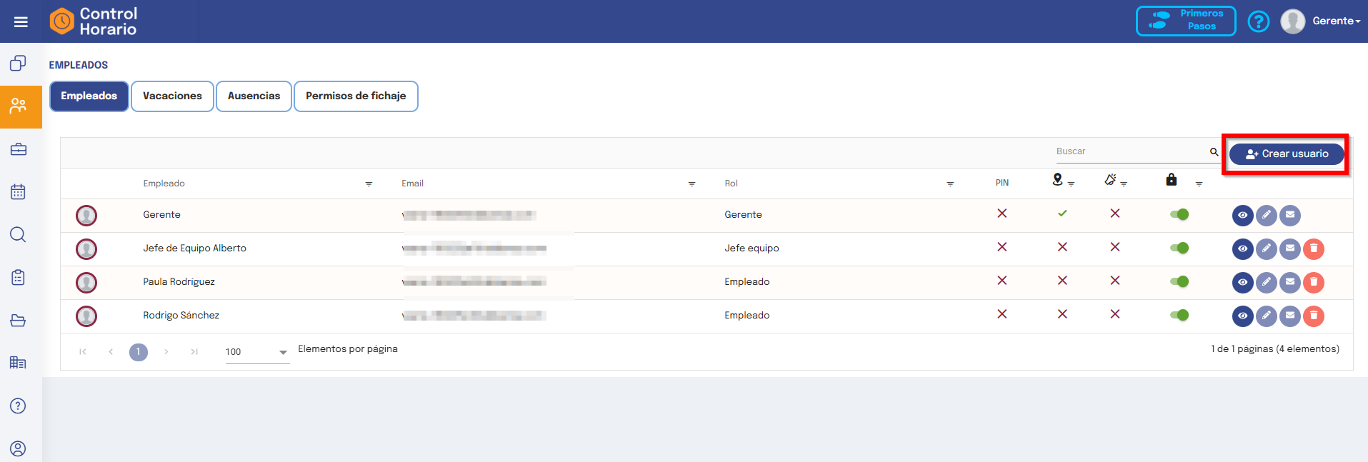 a.- Gerente: El Gerente es el rol que tiene todos los permisos a nivel de visualización de empleados y fichajes. También puede crear nuevos usuarios y hacer compras.