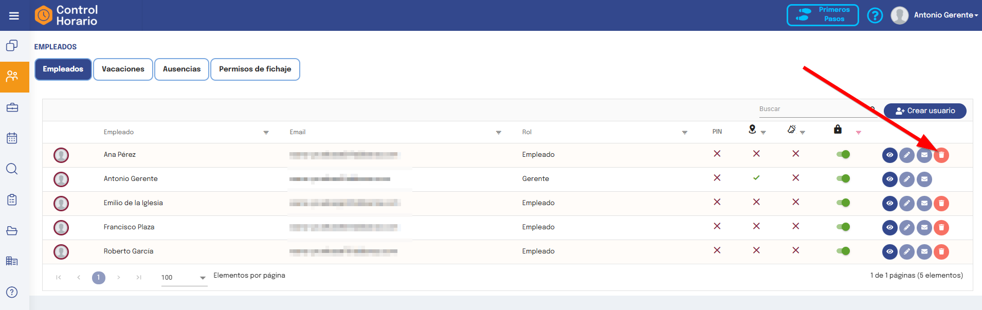 Acceder a la sección Empleados del menú principal, una vez dentro, podremos ver que cada usuario tiene un botón para Habilitar/Deshabilitar los usuarios: