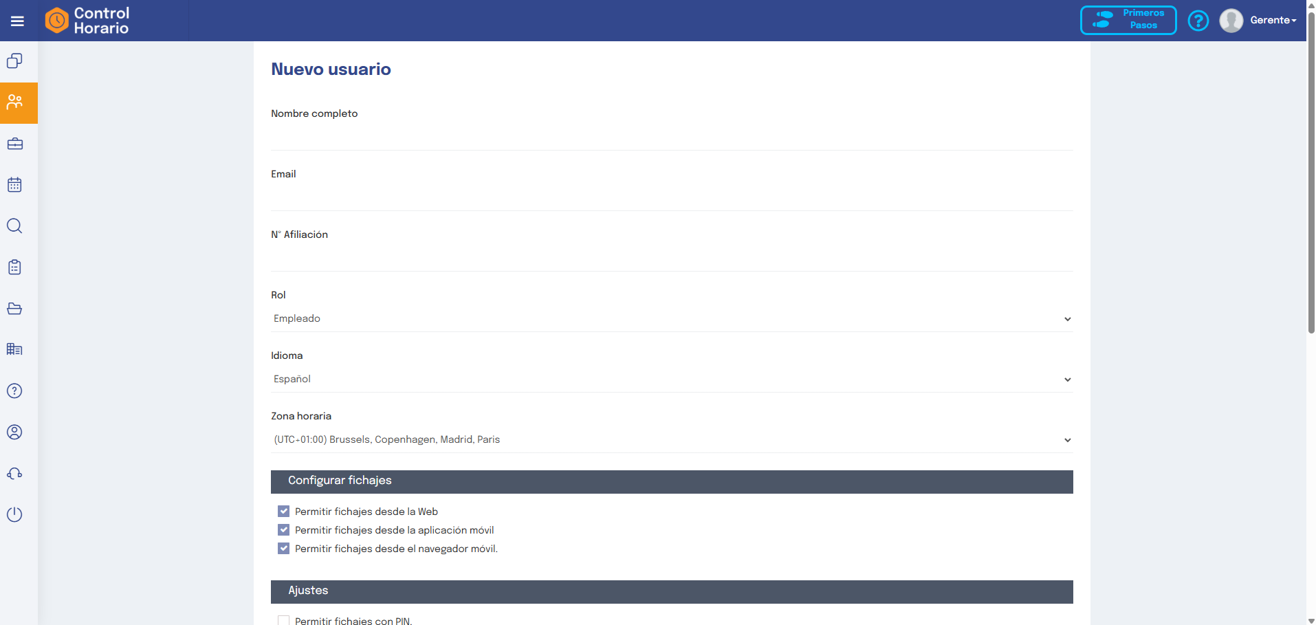 Gerente : El Gerente es el rol que tiene todos los permisos a nivel de visualización de empleados y fichajes. También puede crear nuevos usuarios y hacer compras.