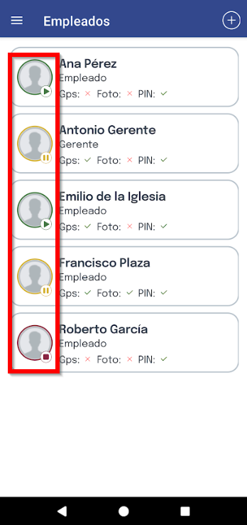 Puedes ver el estado de cada empleado, según el color del círculo alrededor de la fotografía, tal como se indica en la siguiente imagen: