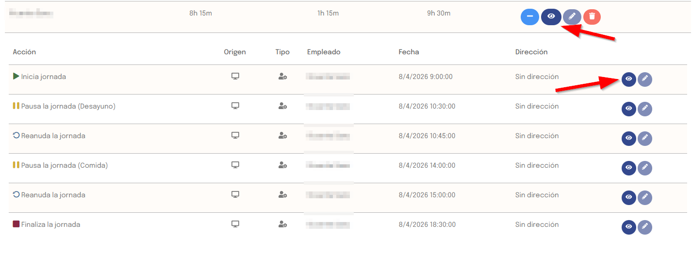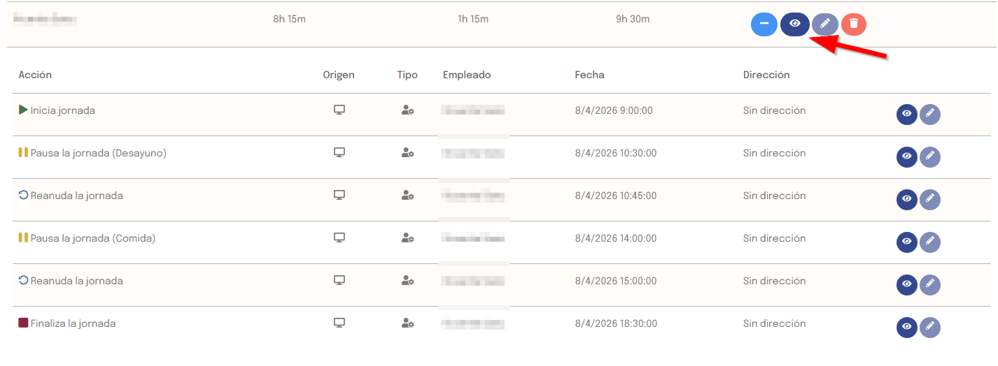 — Tipo de acción: inicio de jornada, fin de jornada, pausa, reanudación, jornada añadida manualmente, jornada modificada o jornada eliminada.