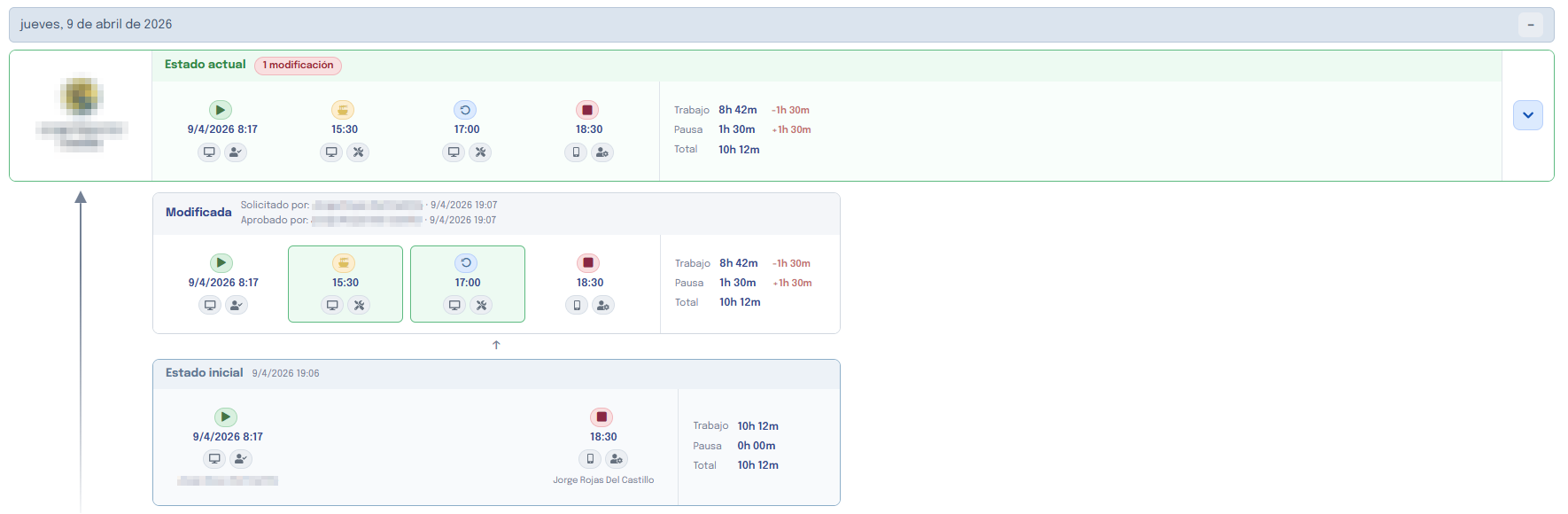 La información mostrada es la misma que en el historial general: la línea de tiempo completa con todos los detalles de cada cambio registrado en esa jornada.