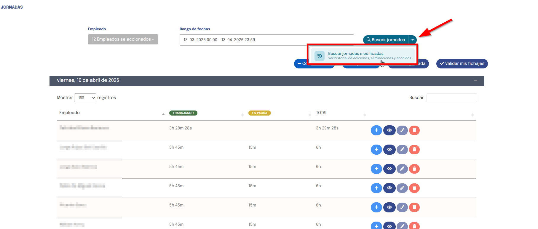 Puedes acceder al historial de cambios de una jornada de dos formas: