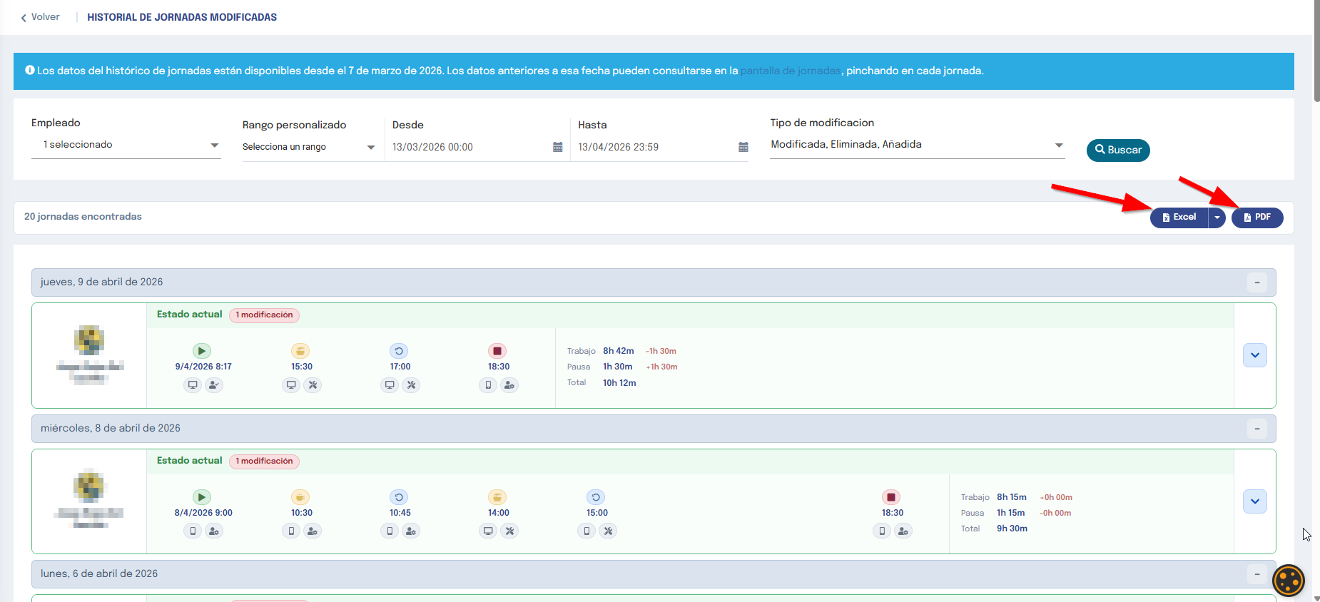 — Modificada: jornadas en las que se ha editado uno o más fichajes.