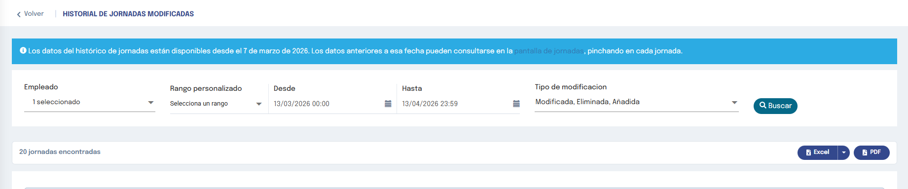 — Plan Premium: el historial está disponible desde el 7 de marzo de 2026, fecha en la que el sistema comenzó a registrar los cambios en jornadas.